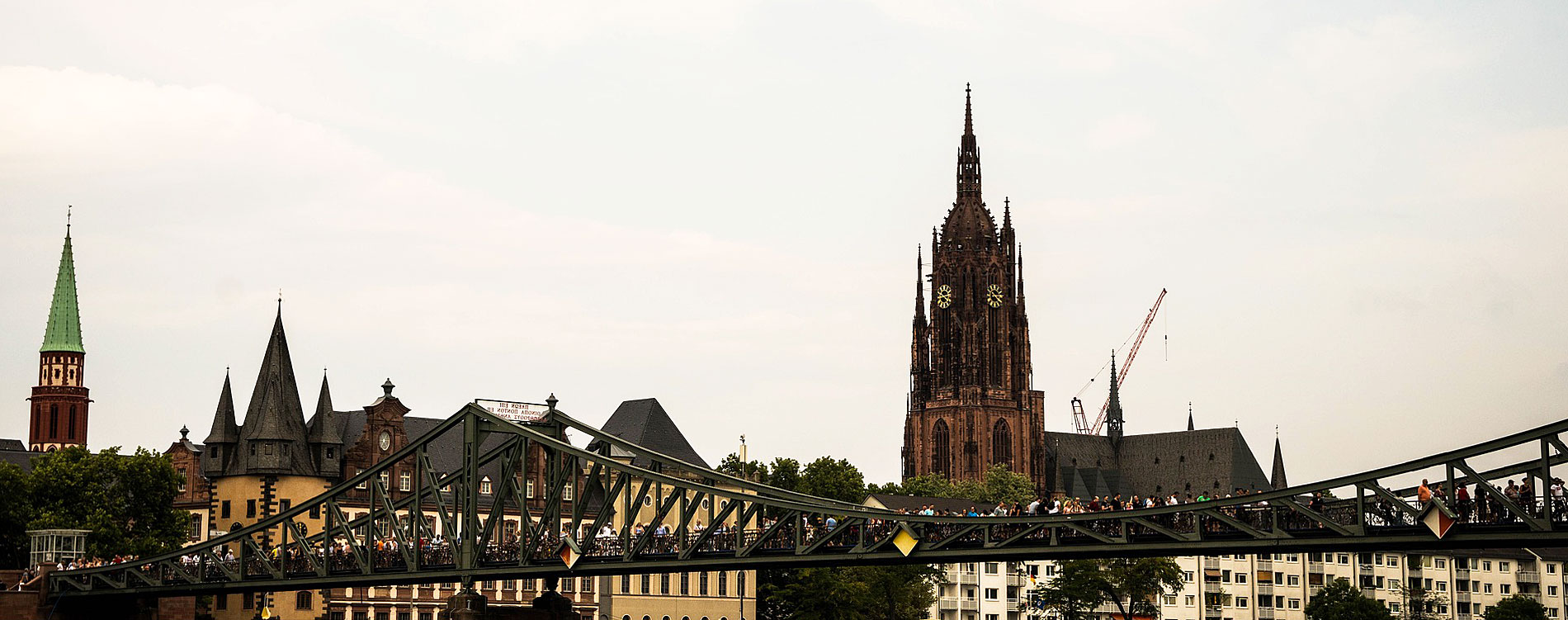 Blick auf Frankfurt am Main mit Eiserner Steg und Kaiserdom.