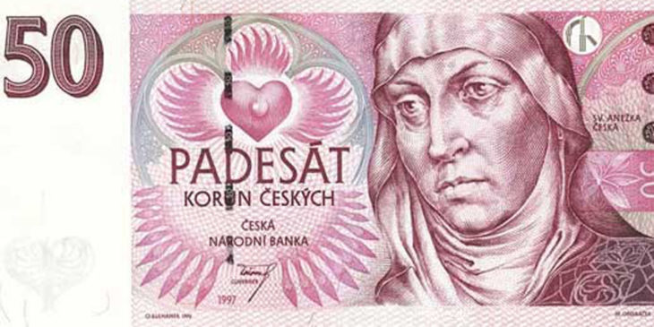 Ehemals kommunistische Länder haben sogar Heilige auf Münzen und Geldscheinen: Auf tschechischen und slowakischen Kronen sind der heilige Wenzel und historische Kreuze abgebildet, auf dem slowakischen 50-Kronen-Schein waren bis zur Einführung des Euro Cyrill und Method zu sehen, auf dem slowakischen 100-Kronen-Schein die Madonna von Leutschau und auf der bis vor kurzen gültigen 50-Kronen-Banknote Tschechiens sahen wir die Agnes von Böhmen mit den Zusatz „Heilige Agnes von Böhmen”.