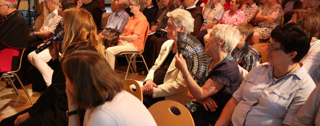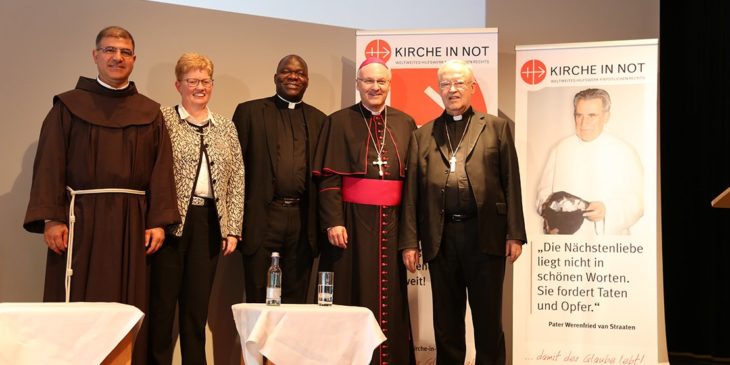 Die Gottverwiesenheit der Christen, die unter Krieg oder Verfolgung leiden, wurde beim anschließenden Podiumsgespräch deutlich. „Der christliche Glaube in Syrien hat jahrhundertealte Wurzeln. Es ist der Glaube der Märtyrer, die stand gehalten haben. Darum bleiben auch wir.“ Dies bekannte Pater Firas Lutfi aus Aleppo. Sein Franziskanerkloster ist zu einer Anlaufstelle für die notleidende Bevölkerung der zerstörten Stadt geworden.