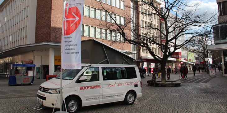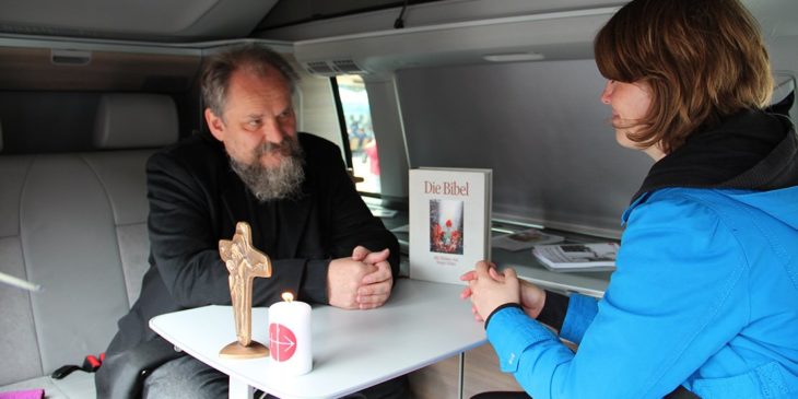 Wie Pater Hermann-Josef Hubka erklärt, wolle KIRCHE IN NOT allen Menschen mit der Aktion einen Denkanstoß in der unmittelbaren Vorbereitung auf Ostern geben. „Oft reicht schon der Anblick des ‚Beichtmobils‘, und die Menschen denken über ihr Leben nach“, sagt er.