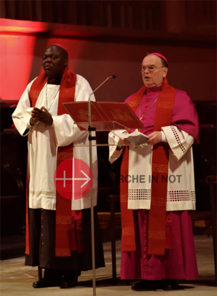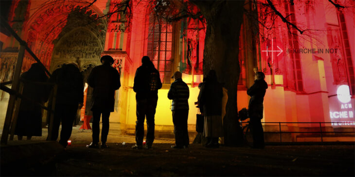 Gebetsabend innen und außen blutrot beleuchtet gewesen. Bischof Bertram Meier erinnerte in seiner Predigt daran, dass das Menschenrecht auf Religionsfreiheit auch in Deutschland verteidigt werden müsse. Obwohl die Christen in Deutschland keine Verfolgung und Unterdrückung erfahren, werde das Christsein doch immer mehr angefochten und hinterfragt. Selbst Symbole des christlichen Glaubens würden immer öfter aus dem öffentlichen Raum verdrängt. Christen seien daher in der kommenden Adventszeit dazu aufgerufen, aktiv „Salz der Erde“ zu sein.