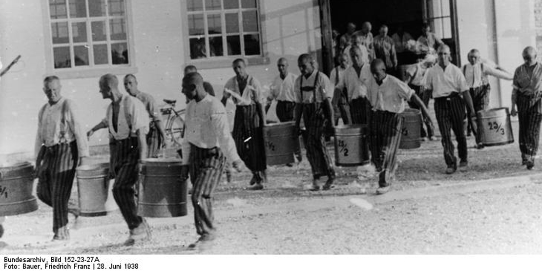 Dachau, Konzentrationslager Schutzhaftlager Dachau.- Häftlinge Töpfe tragend.