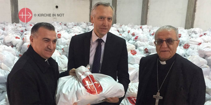 Der damalige EU-Sonderbeauftragte Jan Figel (Mitte) nahm bei einem Besuch im Nordirak im Jahr 2017 auch die Lebensmittelverteilung von „Kirche in Not“ an christliche Binnenflüchtlinge in Augenschein.