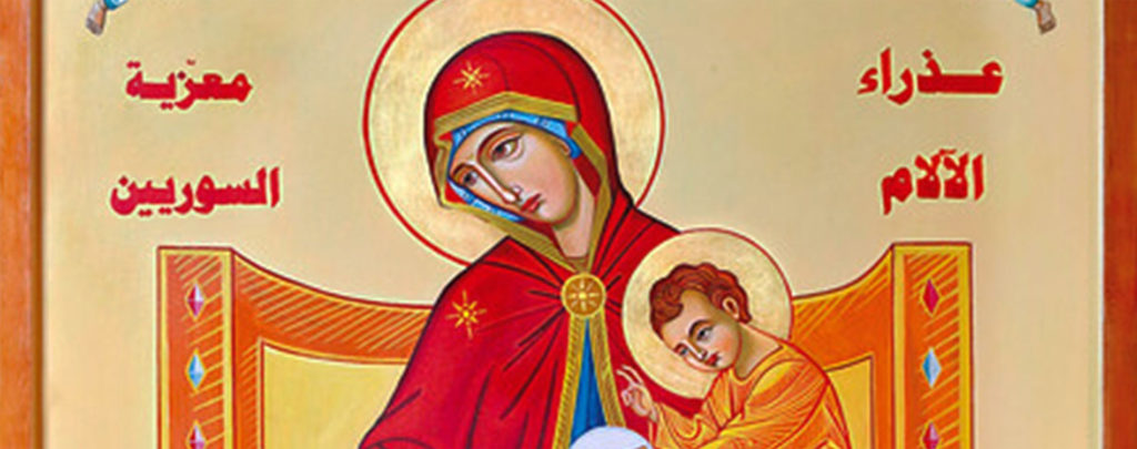 Die Klappkarte im Format DIN A6 zeigt auf der Vorderseite die Ikone „Selige Jungfrau Maria, Schmerzensmutter und Trösterin der Syrer“. Papst Franziskus hat die Ikone am 15. September, dem „Gedenktag der Schmerzen Mariens“, gesegnet.