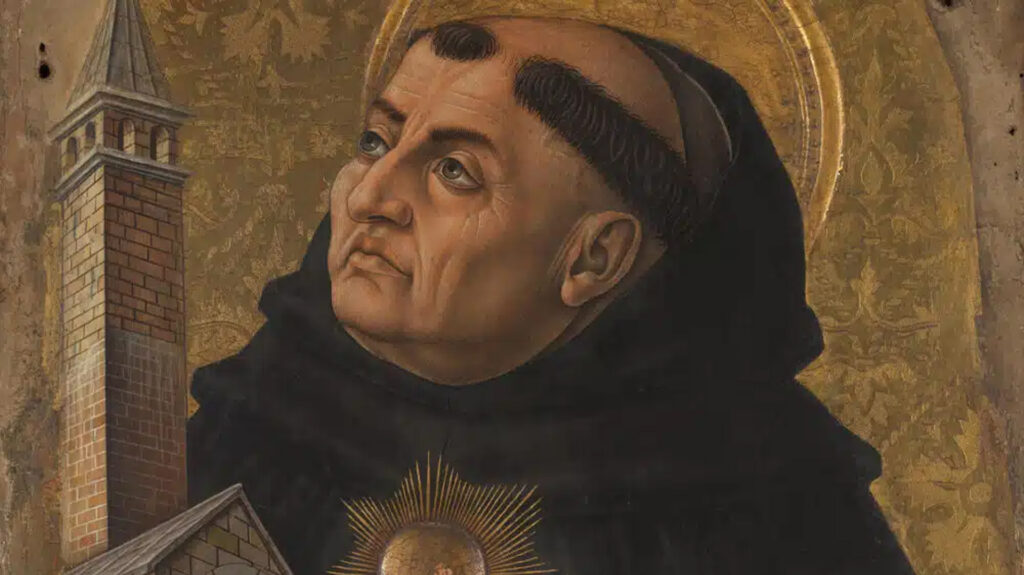 Thomas von Aquin wurde um 1225 geboren. Er trat in den Dominikanerorden ein und studierte in Paris und Köln, wo er unter anderem von Albertus Magnus unterrichtet wurde. Seine philosophischen und theologischen Ansätze verbanden den christlichen Glauben mit dem Denken des griechischen Philosophen Aristoteles. Im Jahr 1323 wurde er von Papst Johannes XXII. heiliggesprochen und 1567 zum Kirchenlehrer erhoben.