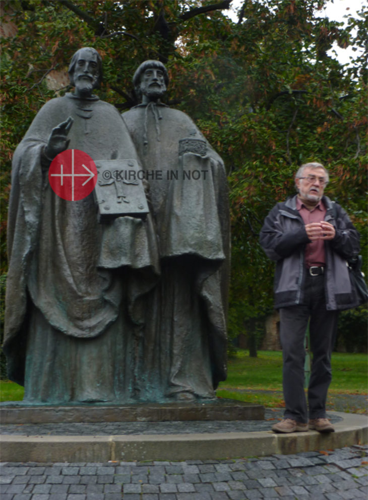 Rudolf Grulich als Reiseleiter einer KIRCHE IN NOT-Wallfahrt vor dem Denkmal von Cyrill und Method in Neutra (Nitra).