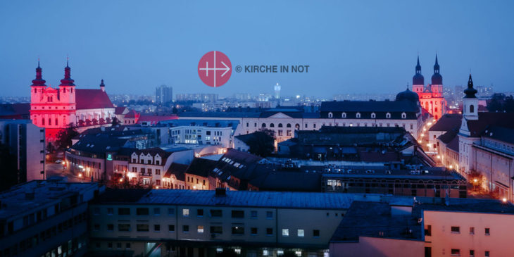 Tyrnau in rot getaucht. Die slowakische Bischofsstadt nahm 2020 teil am „Red Wedenesday“, einer Aktion, mit der KIRCHE IN NOT weltweit auf das Thema Christenverfolgung aufmerksam machen möchte.