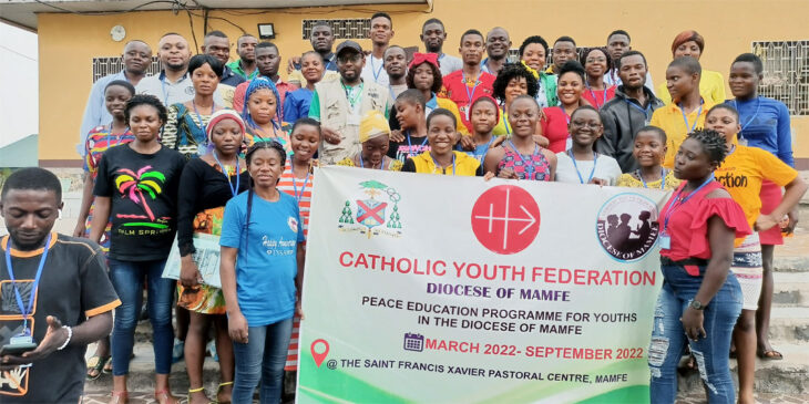 Ein aktuelles Projektbeispiel aus Kamerun: Gruppenfoto mit Jugendlichen aus dem Bistum Mamfe. Sie sind Teilnehmer eines Kurses für Friedenserziehung, der von KIRCHE IN NOT gefördert wird.