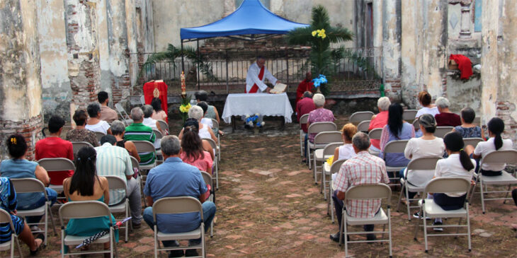 Gottesdienst im Bistum Holguin in einer Kirche ohne Dach.