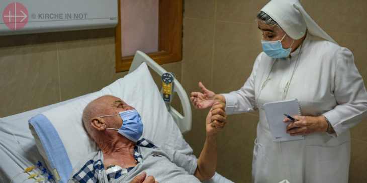 Aktuell sind nur noch zwei Stockwerke funktionsfähig. Einer der Aufzüge konnte repariert werden, um die Patienten in den OP zu bringen. Auch eine Ambulanz für Corona-Test ist eingerichtet. Die Ordensfrauen führen die Klinik, arbeiten auf den Stationen und sind auch seelsorgerisch für die Patienten da. „Ohne sie wäre das Krankenhaus nicht das, was es ist. Sie sind die Kraftquelle unserer Arbeit“, sagt Maron Rabash, der seit 28 Jahren als Anästhesist hier arbeitet. „Dieses Krankenhaus mit seinem christlichen Charakter wird in Beirut sehr dringend gebraucht. Viele Patienten kommen hierher, weil sie wissen, dass sie nach ethischen Werten behandelt werden.“