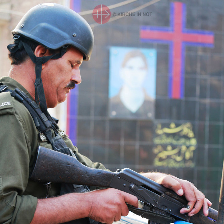 Akash Bashir ist 20 Jahre alt. Die katholische Kirche St. Johannes in Lahore ist eine Art Heimat für ihn, die er auch vor islamistischen Übergriffen schützen will. Deshalb steht er als Sicherheitsmann vor dem Eingangsportal an jenem 15. März 2015, seinem Todestag.