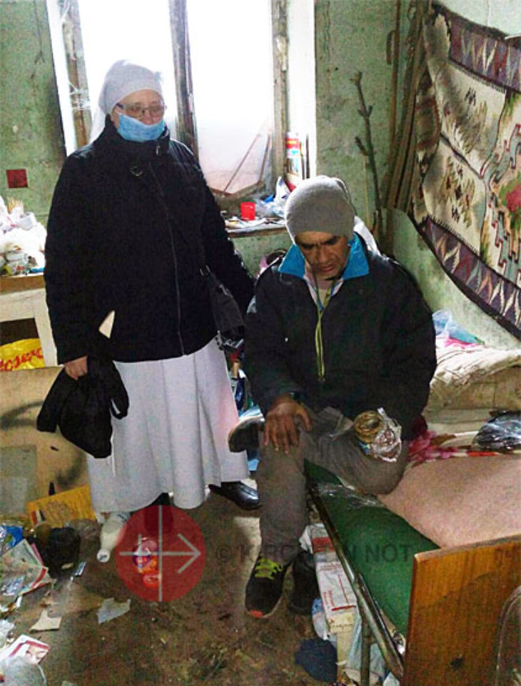 „Jedes Mal, wenn es klingelt und ich die Tür unseres Klosters öffne, sehe ich Menschen in Not“, erzählt Schwester Elena. „Gestern hat uns eine Frau um Essen für ihre drei Kinder gebeten. Nach ihr kam ein Mann, der um Essen für seine Mutter bat … Unter den Bedürftigen gibt es viele alleinstehende Menschen, die keinerlei Unterstützung haben. Wir sind für sie da.“