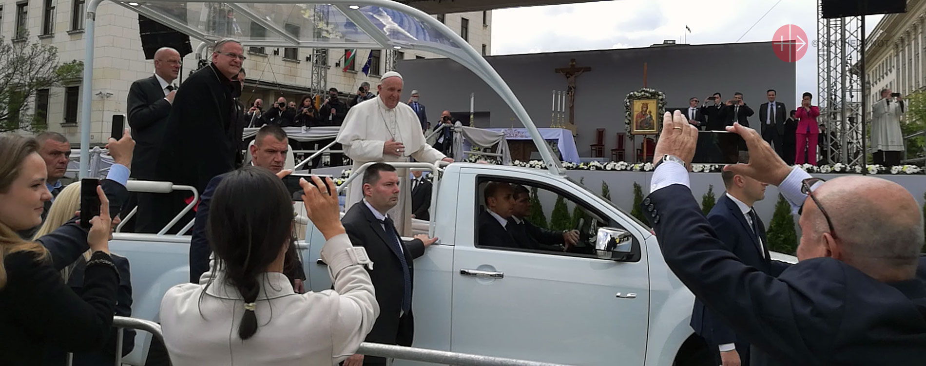 Papst Franziskus auf dem Papamobil in den Straßen der bulgarischen Hauptstadt Sofia.