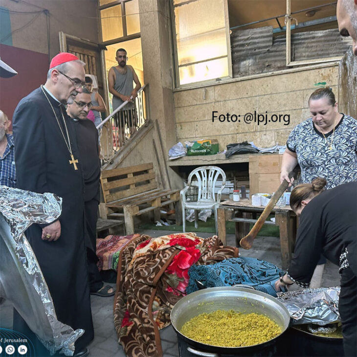 Einen Tag nach dem tödlichen Angriff hatte der Lateinische Patriarch von Jerusalem, Pierbattista Kardinal Pizzaballa, gemeinsam mit dem griechisch-orthodoxen Patriarchen, Theophilus III., die katholische Gemeinde in Gaza besucht, in der sich aktuell rund 500 bis 600 Menschen befinden. „Es ist für die Menschen ein Segen, mit ihm zu beten, ihn um den Segen zu bitten, ihm zuzuhören, seinen Trost zu empfangen“, so Romanelli.