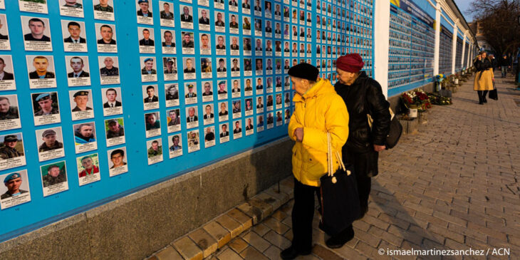 Frauen vor einer Gedenkstätte für gefallene ukrainische Soldaten in Kiew. (Foto: Ismael Martinez Sanchez/KIRCHE IN NOT).
