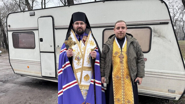 Bischof Maksym Ryabukha mit einem Priester vor einem zur Kapelle umgebauten Wohnwagen © Kirche in Not