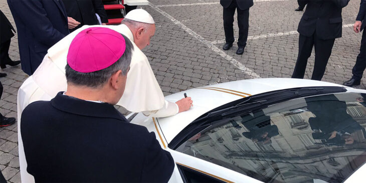 Papst Franziskus signierte 2017 einen Lamborghini und ließ ihn versteigern. Ein Drittel des Erlöses ging an KIRCHE IN NOT, mit der Bitte, es an Christen im Irak weiterzugeben.