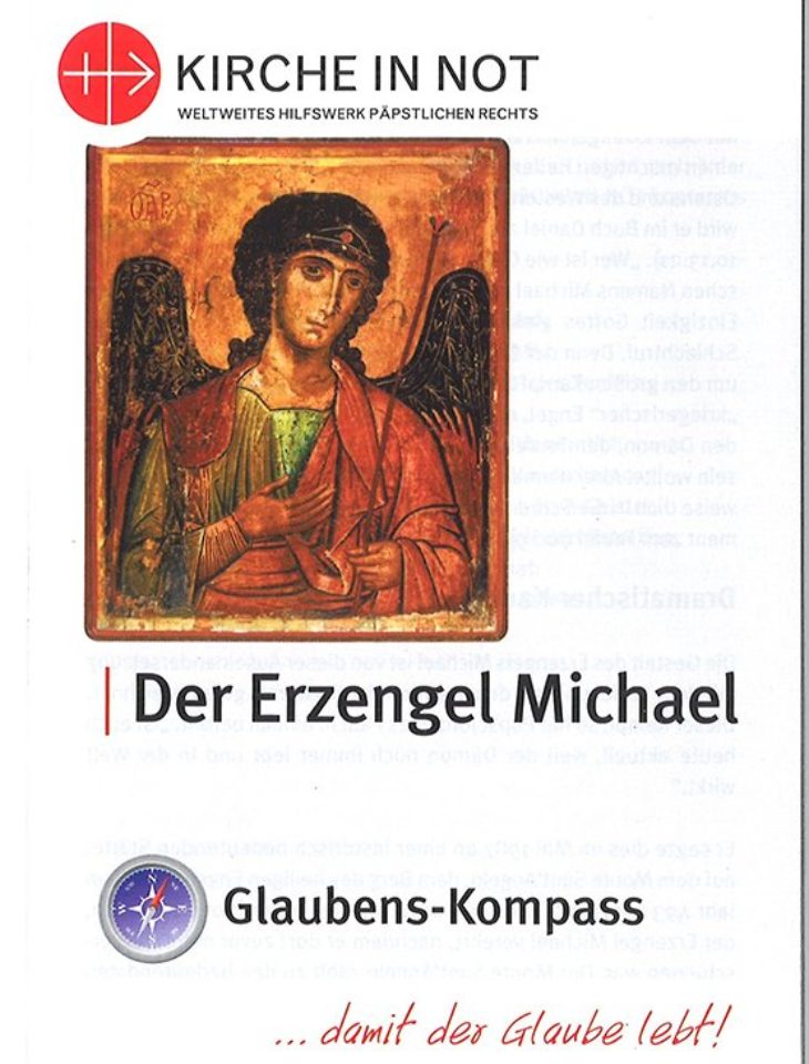 KIRCHE IN NOT bietet zudem ein achtseitiges Faltblatt aus der Reihe „Glaubens-Kompass“ an, in dem das biblische Zeugnis und die Bedeutung des Erzengels Michael als Verteidiger der Kirche und Schutzpatron der Deutschen beschrieben ist.
