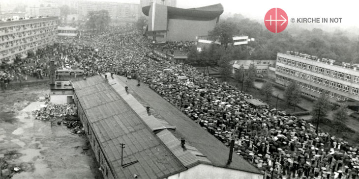Als 1981 in Polen das Kriegsrecht verhängt wurde und viele Menschen in tiefe Not stürzte hat KIRCHE IN NOT zusammen mit anderen Organisationen die Aktion „Ein Schiff für Polen“ auf die Beine gestellt. Hunderte Tonnen an Lebensmitteln, Sanitärartikel, Kleidung, sogar Nähmaschinen und Messwein wurden seinerzeit nach Polen geschickt. Das war bis dahin die größte karitative Hilfsaktion von KIRCHE IN NOT.