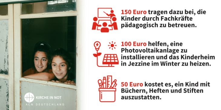 Viele sind psychisch angeschlagen und frustriert. Immer häufiger gibt es Fälle, wo Kinder nicht in ihren Familien bleiben können. Die „Schwestern der heiligen Familie“ haben in Jezzine ein Kinderheim gegründet, um diesen Kindern Schutz und Aufmerksamkeit zu schenken. Etwa 30 Kinder essen, schlafen, spielen und lernen hier nach der Schule.