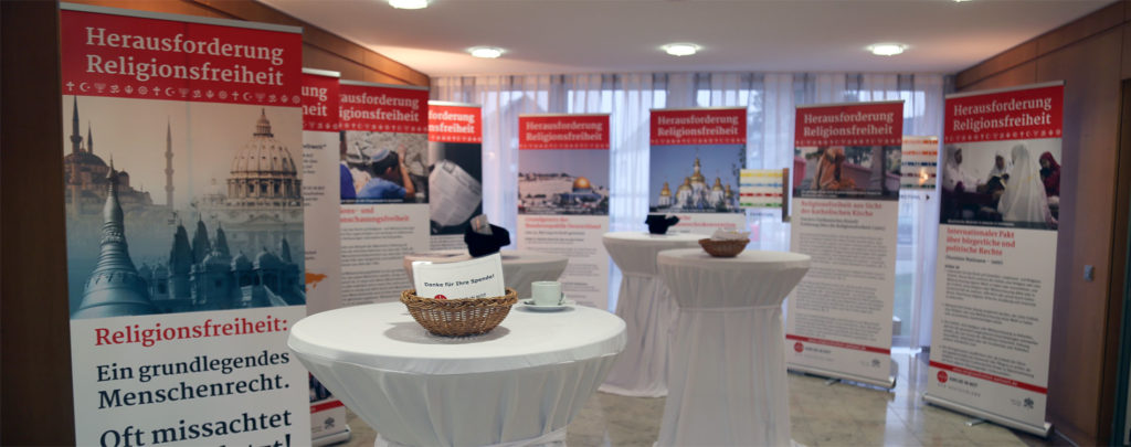 Bei der Ausstellung „Herausforderung Religionsfreiheit“ werden auf 18 bedruckten Bannern übersichtlich die Aspekte der Religionsfreiheit im Grundgesetz, in Richtlinien der Europäischen Union und der Vereinten Nationen vorgestellt. Dabei gibt es Verweise auf Staaten, in denen dieses Grundrecht vernachlässigt wird.