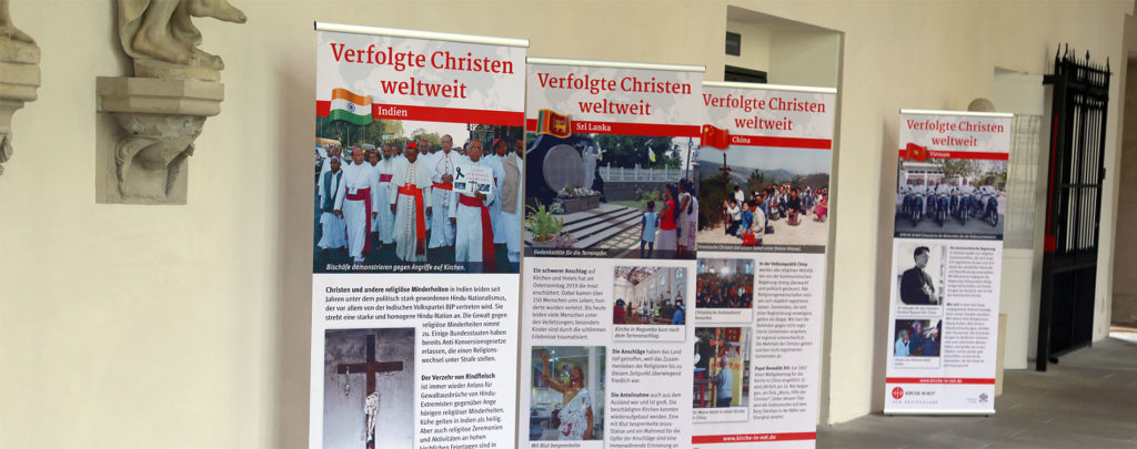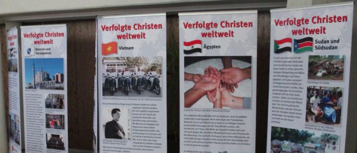 Wir haben eine Ausstellung für Schulen, Pfarreien oder sonstige Einrichtungen zusammengestellt, um auf die Christenverfolgung weltweit aufmerksam zu machen. Darin werden einige Länder vorgestellt, in denen Christen besonders unter Unterdrückung, Diskriminierung und Verfolgung leiden.