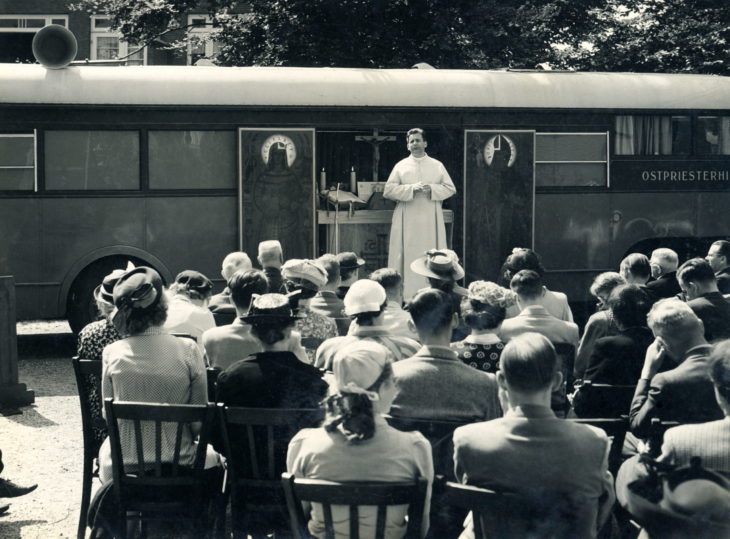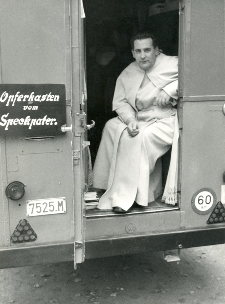 Aktion „Ein Fahrzeug für Gott”: Motorisierung der ersten „Rucksackpriester”, die unter den Vertriebenen im protestantischen Gebiet der norddeutschen Diaspora Seelsorge leisten, wo es damals kaum katholische Pfarreien gab.
