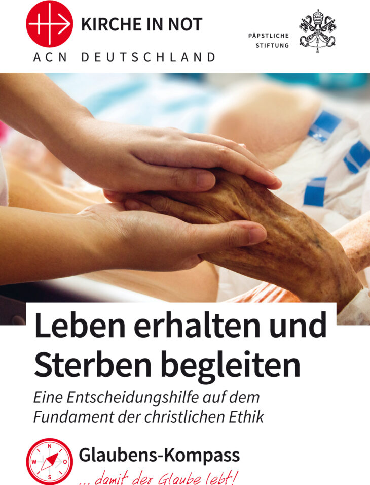 Mit dem Faltblatt möchte KIRCHE IN NOT Betroffenen in verunsichernden Situationen helfen, vernunftgeleitete Entscheidungen zum Wohl ihrer Verwandten auf der Grundlage christlicher Grundsätze zu treffen. Der „Glaubens-Kompass“ rät zu palliativmedizinischer Betreuung, wenn therapeutische Maßnahmen keine Aussicht auf Erfolg mehr haben.