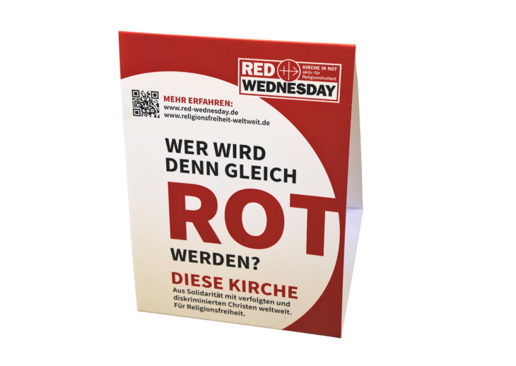 Machen Sie auf Ihre Veranstaltung/ Ihren Gottesdienst zum Red Wednesday aufmerksam! Leichter Aufsteller aus Hohlkammerplatten, aufklappen, geeignet beschweren, und Sie werden gesehen.