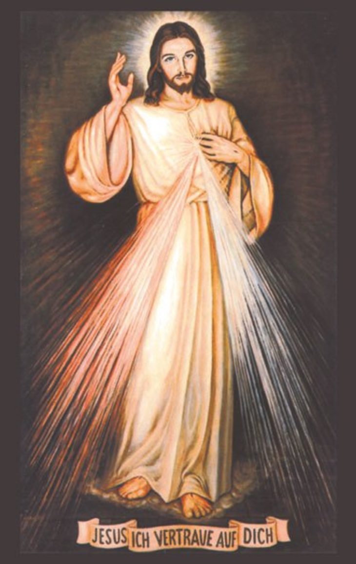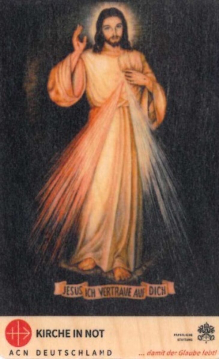 Art.-Nr. 6137Die Gebetskarte zeigt ein Bild des „Barmherzigen Jesus“, das ein polnischer Künstler nach den Angaben der heiligen Ordensschwester Faustina Kowalska gemalt hat. Sie hatte in den 1930er-Jahren Visionen von Jesus Christus. Der heilige Papst Johannes Paul II. förderte die Verehrung dieses Bildes und führte im Jahr 2000 den Sonntag nach Ostern weltweit als „Sonntag der Barmherzigkeit“ ein.
