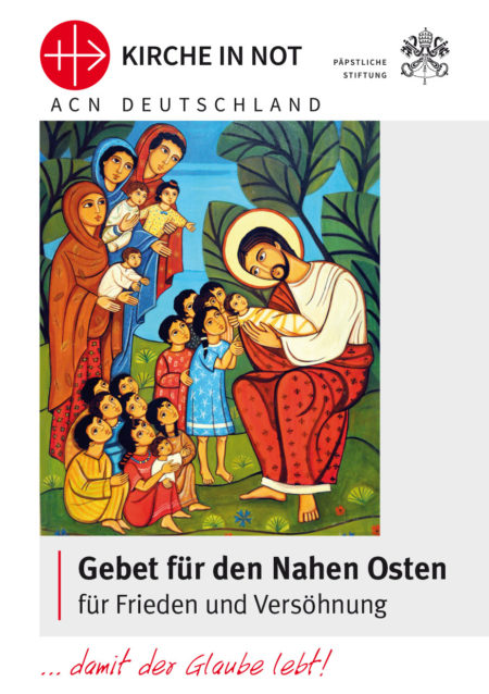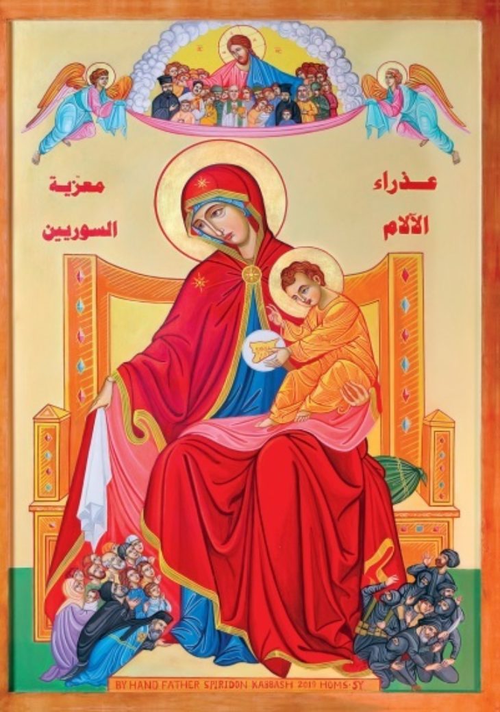 Karte im Format DIN A6. Sie zeigt auf der Vorderseite die Ikone „Selige Jungfrau Maria, Schmerzensmutter und Trösterin der Syrer“. Papst Franziskus hat die Original-Ikone im September 2019.