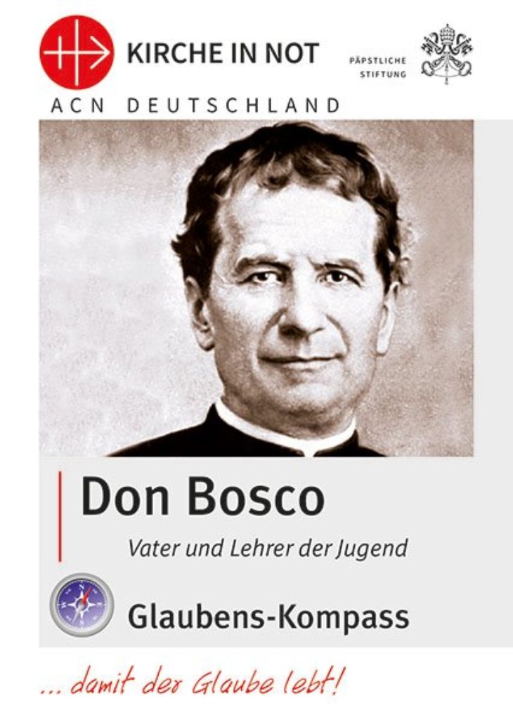 DIN A6, 10,5 x 14,8 cm, 8-12 Seiten, farbig Art.-Nr. 4198Anlässlich des 200. Geburtstags von Don Bosco am 16. August 2015 hat KIRCHE IN NOT einen Glaubens-Kompass über das Wirken des italienischen Ordensgründers herausgegeben. Das Faltblatt im Format DIN A6 informiert über die Biografie des Heiligen, sein soziales Engagement für Kinder und Jugendliche, das ihn berühmt gemacht hat, sowie über seine Gründung der Ordensgemeinschaft der Salesianer Don Boscos.