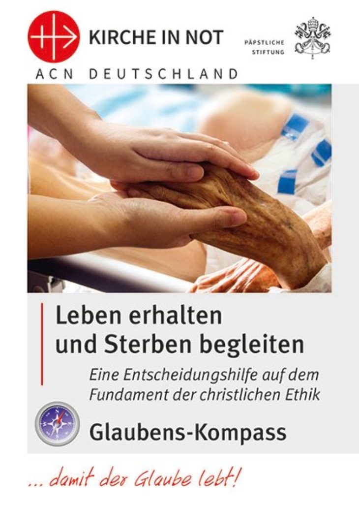 Mit dem Faltblatt möchte KIRCHE IN NOT Betroffenen in verunsichernden Situationen helfen, vernunftgeleitete Entscheidungen zum Wohl ihrer Verwandten auf der Grundlage christlicher Grundsätze zu treffen. Der Glaubens-Kompass rät zu palliativmedizinischer Betreuung, wenn therapeutische Maßnahmen keine Aussicht auf Erfolg mehr haben. So können zumindest Schmerzen gelindert und ein Sterben ermöglicht werden, das die körperlichen, seelischen und geistlichen Bedürfnisse des Menschen im Blick hat. Dabei wird jede Form von Euthanasie strikt abgelehnt. Andererseits warnt das Heftchen vor unverhältnismäßigen Therapien, wenn beispielsweise Aufwand und Nutzen in keinem Verhältnis zueinander stehen und strapaziöse Therapien den Tod lediglich um wenige Tage oder Wochen hinauszögern.