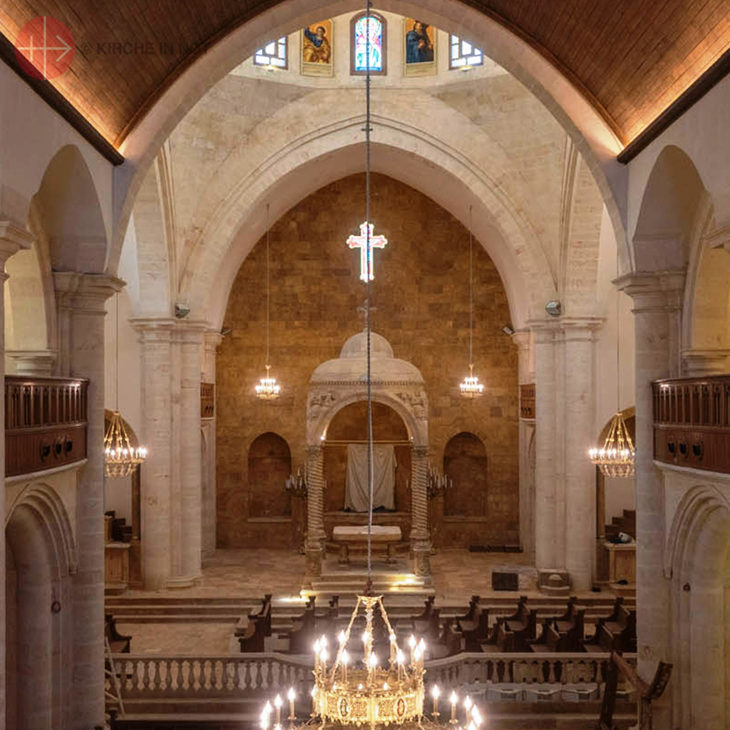 Die wiederaufgebaute Kathedrale Sankt Elias beherbergt die maronitisch-katholische Gemeinde von Aleppo. Sie gehört zu den kleineren christlichen Gemeinschaften in Aleppo, ist aber bei der humanitären und pastoralen Betreuung der Bevölkerung sehr aktiv. „Unser Wunsch ist es, zu bleiben – nicht nur, weil wir hier geboren wurden oder weil wir keine andere Möglichkeiten hatten, sondern weil es unsere Mission ist“, erklärte Erzbischof Tobji im Gespräch mit KIRCHE IN NOT. „Wir sind eine Familie. Meine Absicht war es, das gemeinsame Haus zu erneuern, dass uns vereint und willkommen heißt.“